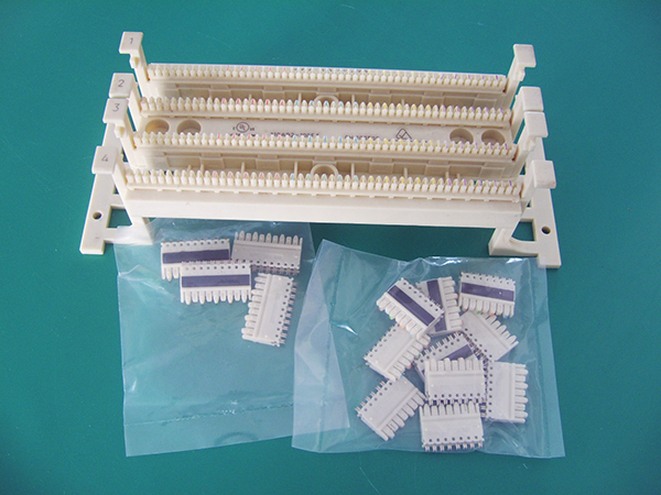 跳線架是由阻燃的模塊塑料件組成,其上裝有若干齒形條,用于端接線對,用788J1專用工具可將線對按線序依次“沖壓”到跳線架上,完成語音主干線纜以及語音水平線纜的端接。