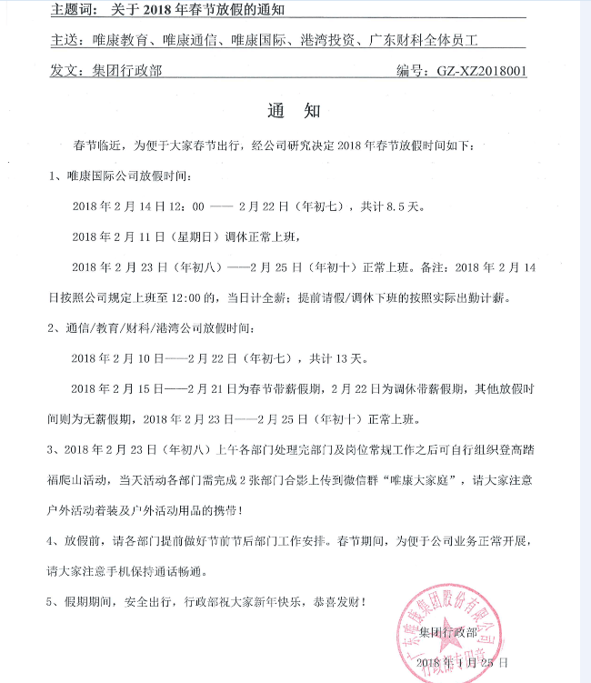 唯康通信關(guān)于2018年春節(jié)放假的通知