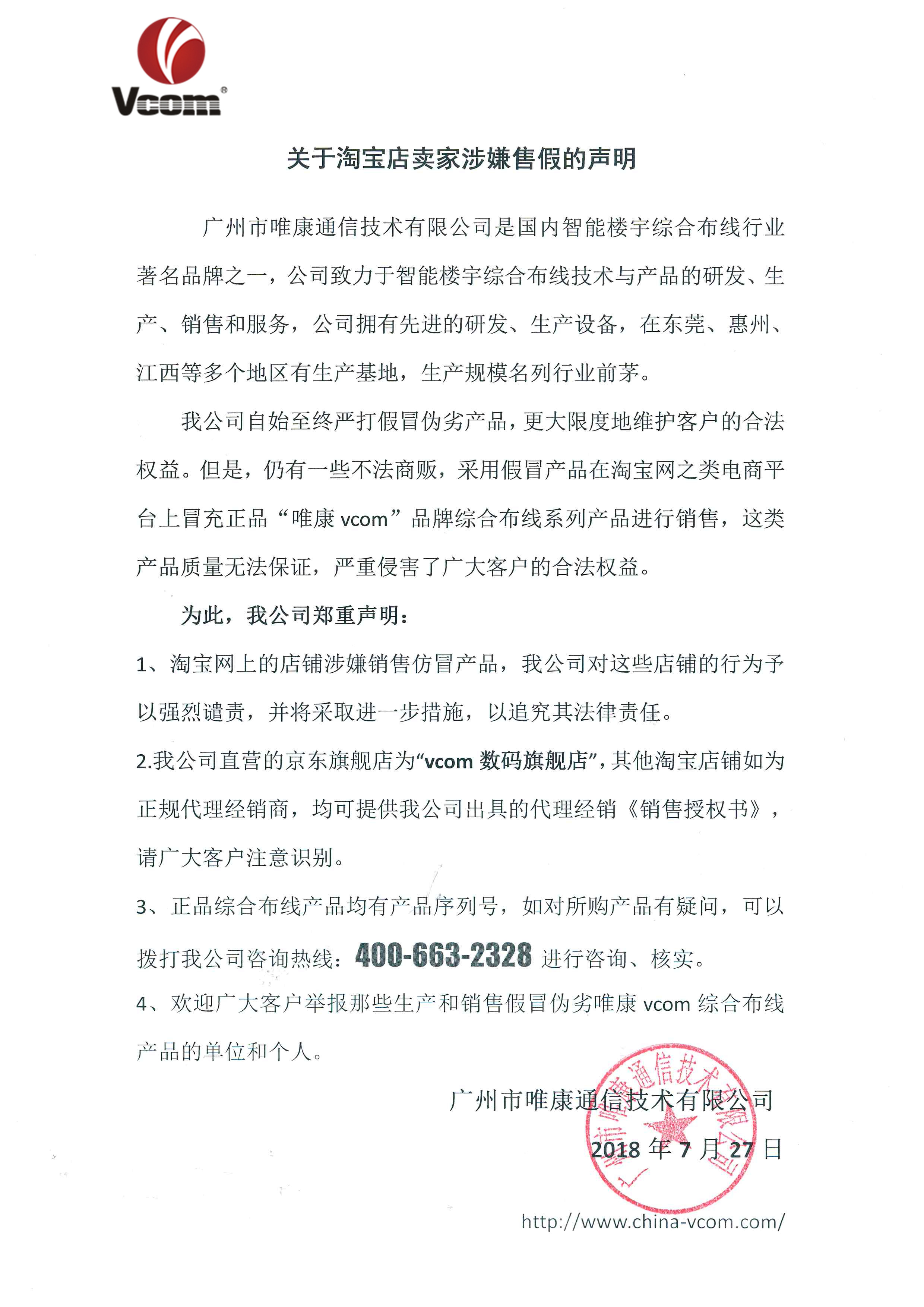 我公司一直致力于嚴打假冒偽劣產品,更大限度地維護客戶的合法權益,但是仍有一些不法商販,將假冒產品在淘寶網之類的電商平臺上冒充正品“唯康 vcom”品牌綜合布線系列產品進行銷售,這類產品質量無法保證,嚴重侵害了廣大客戶的合法權益。