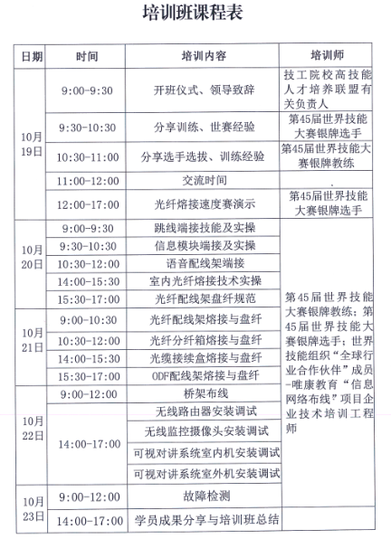 按照人社部關于“努力為世界奉獻一屆富有新意、影響深遠的世界技能大賽”的要求,為了提高我國選手第46屆世界技能大賽信息網絡布線項目競賽技能水平,培訓推廣第45屆世界技能大賽信息網絡布線賽項技術標準,助力提升第46屆世界技能大賽各省市區選拔賽和全國選拔賽備賽水平,普及世界技能大賽信息網絡布線項目及專業建設,做好世賽成果轉化工作,技工院校高技能人才培養聯盟(以下簡稱聯盟)擬與聯盟戰略合作企業、世界技能組織“全球行業合作伙伴”成員、第44屆和第45屆世賽信息網絡布線賽項核心贊助企業廣東唯康教育科技股份有限公司(以下簡稱唯康教育),共同舉辦“世界技能大賽信息網絡布線項目技術技能培訓班”。