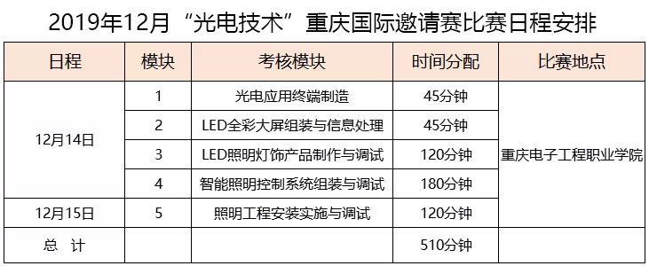 本次比賽項目共設置了5個模塊,包括模塊1:光電應用終端制造,時長45分鐘;模塊2:LED全彩大屏組裝與信息處理,時長45分鐘;模塊3:LED照明燈飾產品制作與調試,時長120分鐘;模塊4:智能照明控制系統組裝與調試,時長180分鐘;模塊5:照明工程安裝實施與調試,時長120分鐘,共計8個小時。